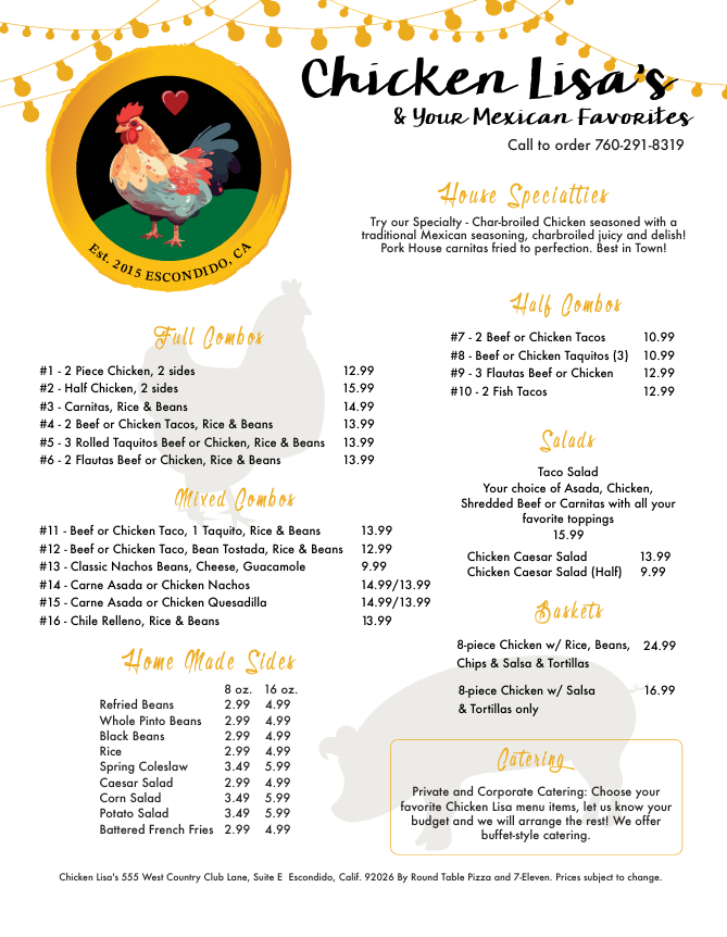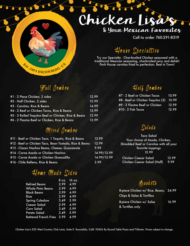 Mon: 09:00 AM - 08:30 PMCopyright © 2025 Chicken Lisa's and Your Mexican Favorites All Rights Reserved. Sitemap. Accessibility Statement